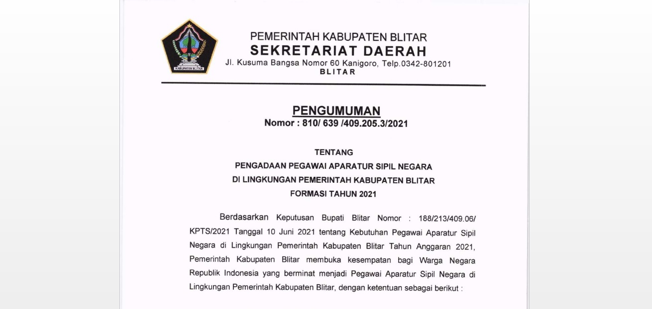 Pengumuman Pengadaan Pegawai ASN Kab Blitar dapat diunduh disini Ketentuan terkait syarat STR CPNS dan persyaratan / sertifikasi PPPK dapat diunduh disini