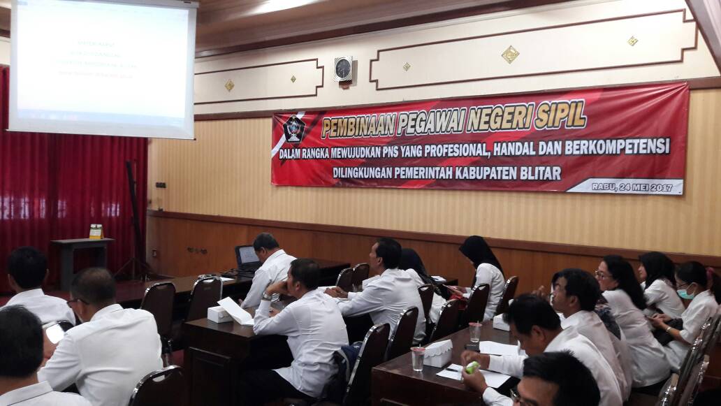 PEMBINAAN PEGAWAI NEGERI SIPIL – 24/05/2017 Posted on 29/05/201729/05/2017 by Admin PEMBINAAN PNS – Dalam rangka mewujudkan PNS yang profesional, handal, dan berkompetensi di lingkungan Pemerintah Kabupaten Blitar Pembukaan Rapat dibuka oleh Bapak Sekretaris Daerah Kabupaten Blitar, dengan Narasumber dari KANREG II BKN Surabaya